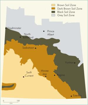 Agricultural regions based on the two main types of farms combined reveal a close relationship between these regions and the main soil zones (Figures AR-2 and AR-3). Grain and oilseed farms combined with beef cattle farms are dominant (50-75% of all farms) or predominant (76% or more of all farms) over much of the relatively cool and moist Black and Grey soil zones (Figures AR-2 and AR-3). Smaller regions occur in the drier Dark Brown and Brown soil zones, with beef cattle farms generally on the rougher lands and grain and oilseed farms on the more level land. Regions of grain and oilseed farms combined with wheat farms tend to be located on the moderately moist Dark Brown soil zone as well as in adjacent and moister parts of the generally dry Brown soil zone (Figures AR-2 and AR-3). Wheat and beef cattle regions occupy small patches in the core of the Brown soil zone in areas either too dry for most cash crops except wheat, or too dry or rough for other than beef cattle.