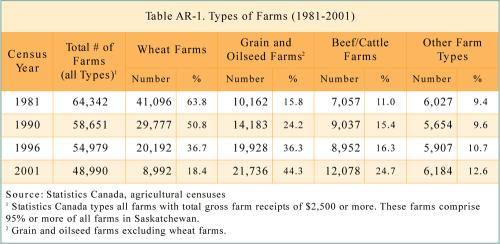 Before 1996, most of Saskatchewan's farms were classified as wheat farms. However, recent years have seen a sharp percentage decline in wheat farms and a corresponding increase in grain and oilseed farms as well as beef cattle farms (Table AR-1). The decline of wheat farms is almost entirely explained by a reduction in spring wheat. Grain and oilseed farms have dramatically increased, partly because of a rise in economic importance of cereal crops other than wheat, specialty crops and oilseeds (Table AR-2). On many former wheat farms, these crops now provide the majority of farm income. On other farms, wheat is still the main source of income but now accounts for less than 51% of farm income, so wheat earnings must be combined with income from other sources to determine a farm type. In most cases, these farms have become grain and oilseed farms. Beef cattle farms have also increased, in part because of farmers diversifying away from wheat.